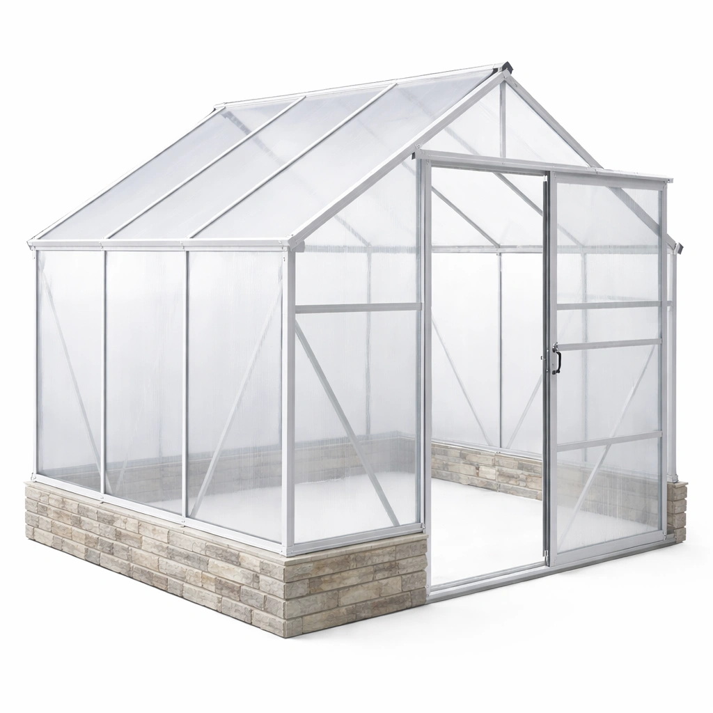 Das Gewächshaus besteht aus einem Rahmen aus Aluminium und einer Abdeckung aus 6 mm Polycarbonat.
