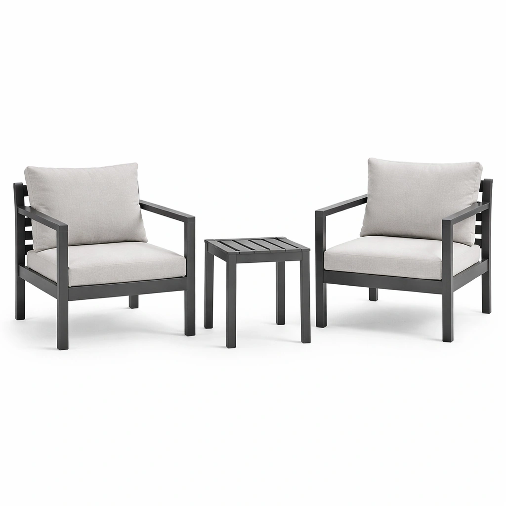Das Gartenmöbel-Set umfasst zwei Stühle und einen Tisch. Der Rahmen besteht aus Aluminium, die Kissen aus Polyestergewebe mit Schaumstofffüllung.